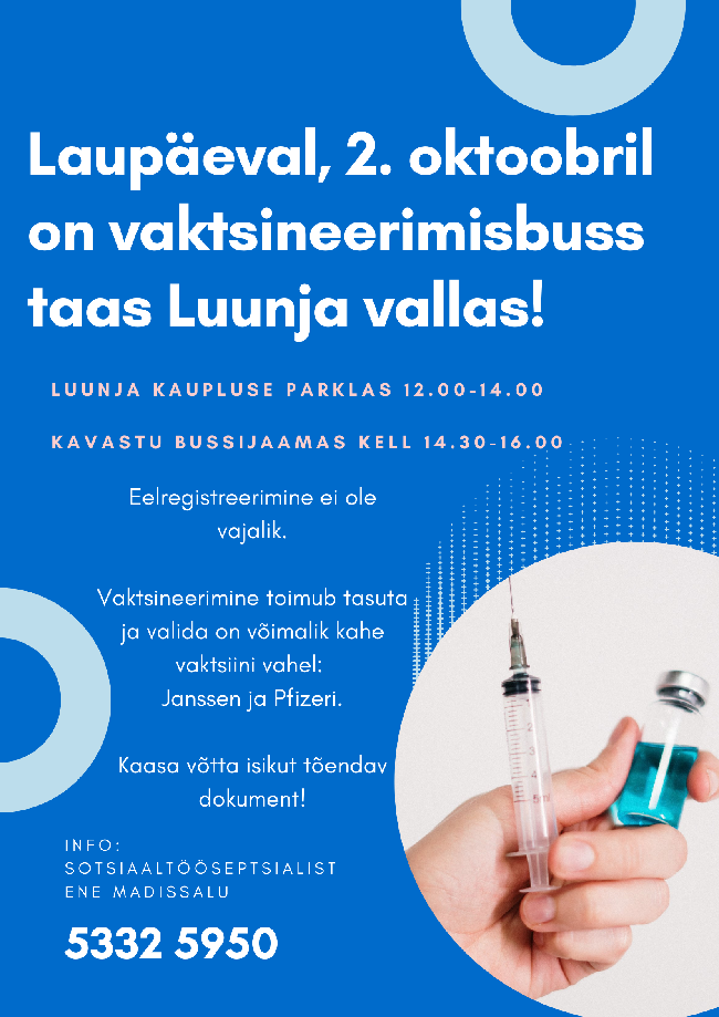 Laupäeval, 2. oktoobril on Tartu vaktsineerimisbuss Luunjas!